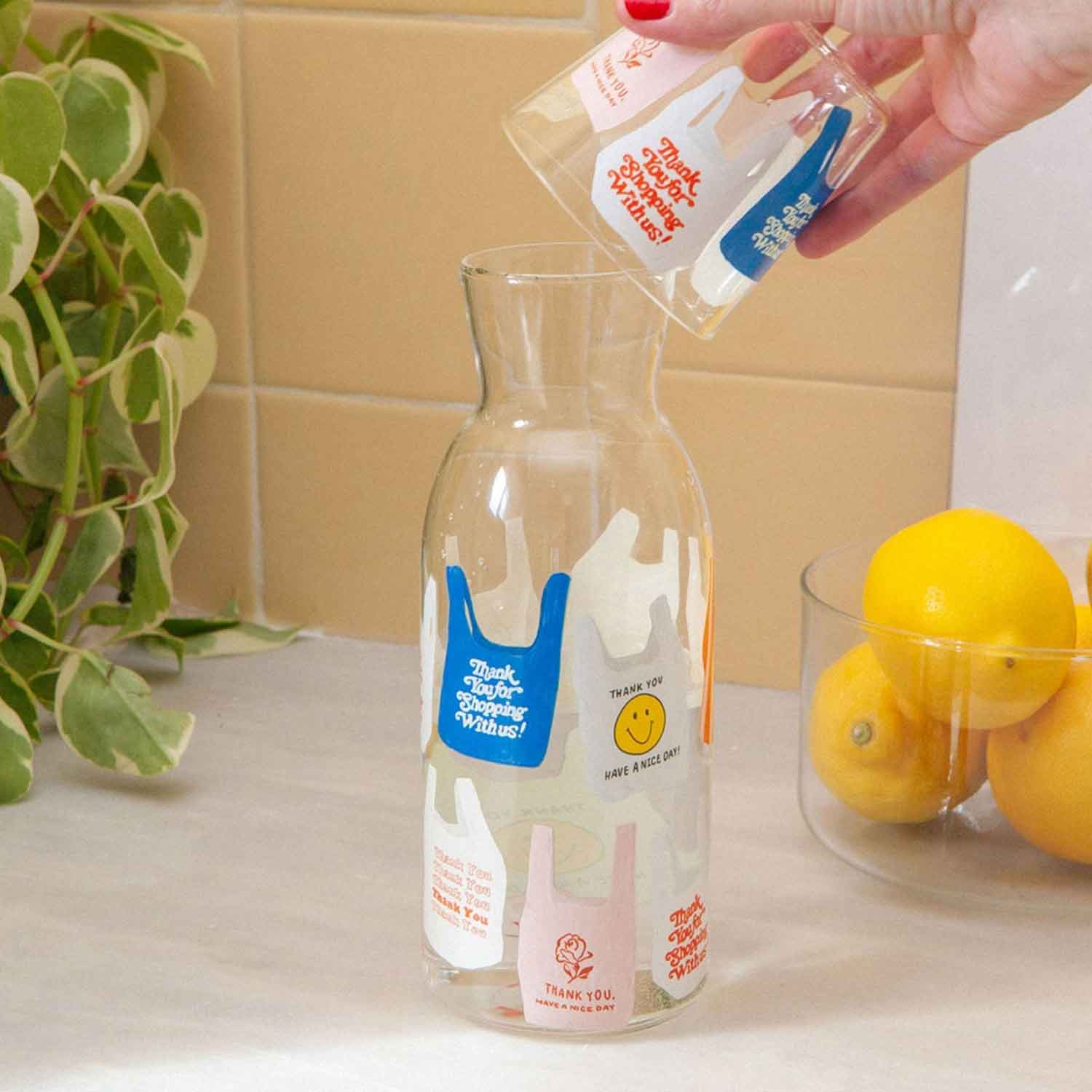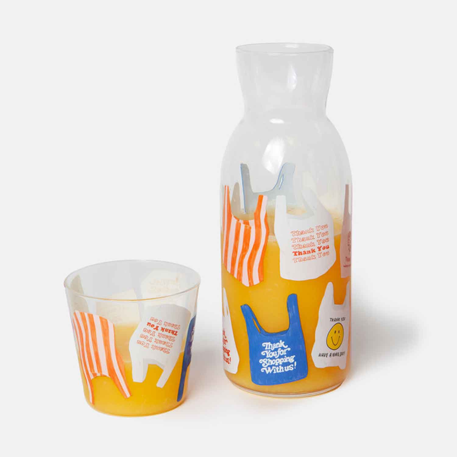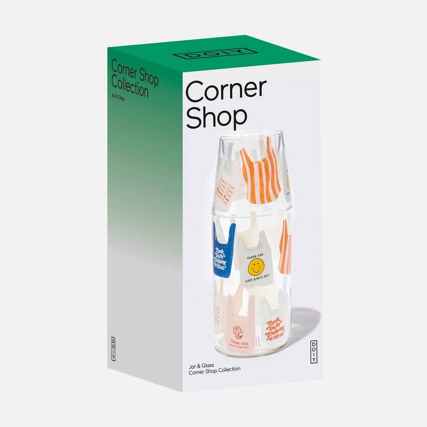 Jar and glass set with shopping bag illustrations, transporting you to the cherished memories of neighborhood corner shops and beloved treats from yesteryears.