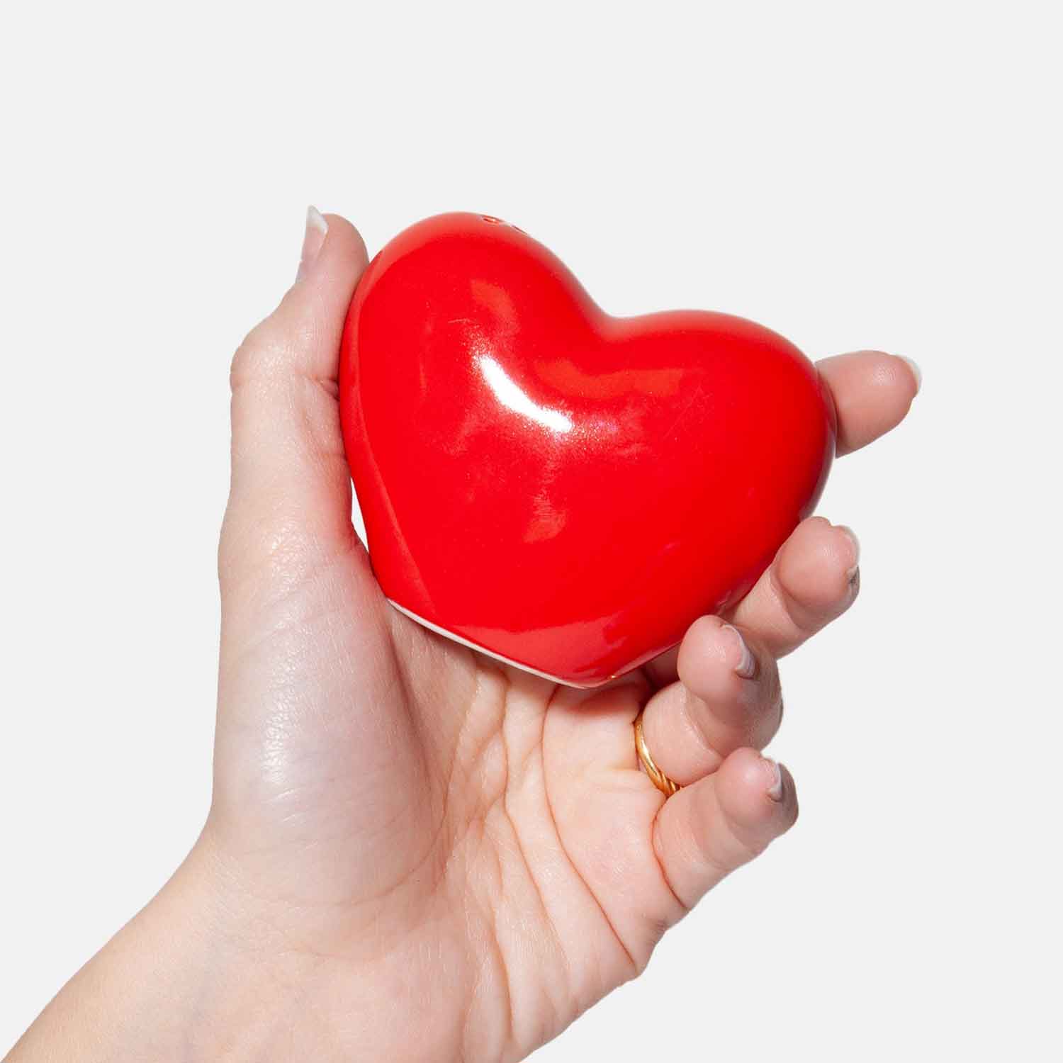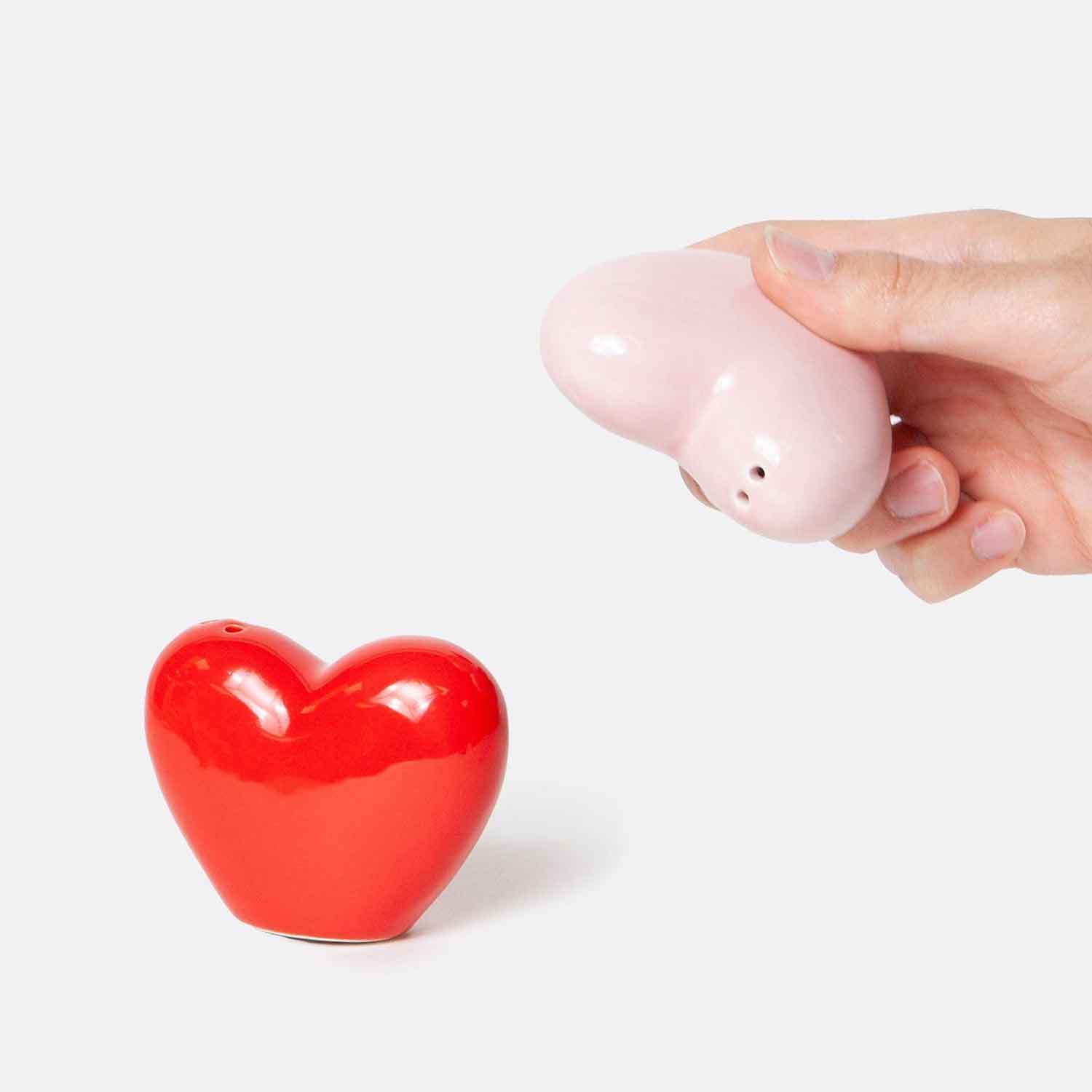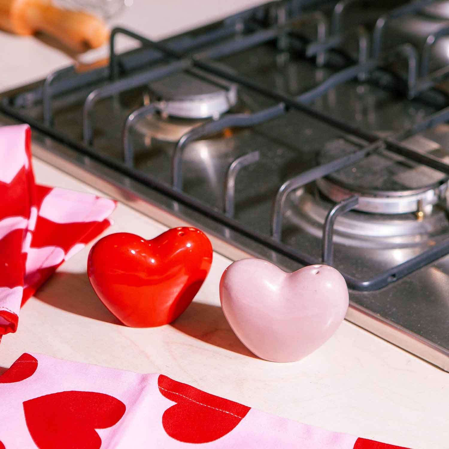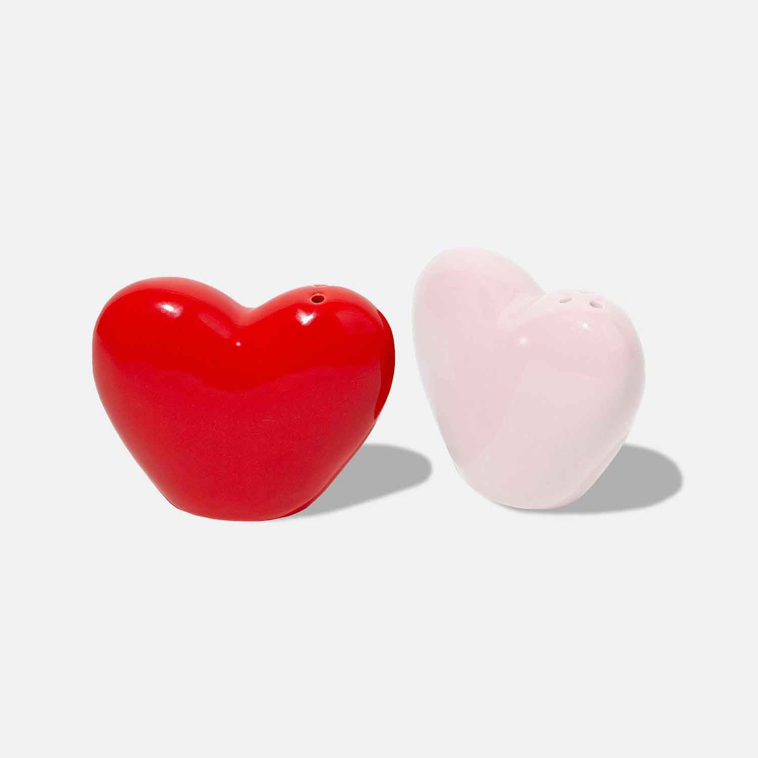 Ceramic salt and pepper shakers shaped as hearts to share and display your love at home.