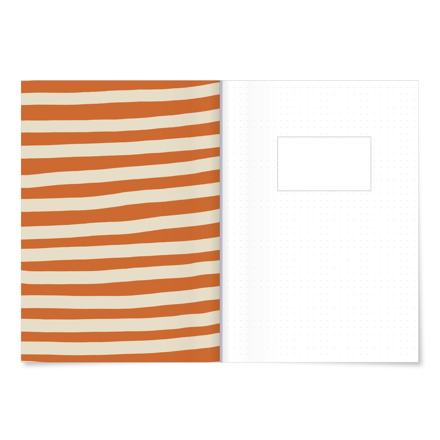 Notebook in DIN A5 format, gently dotted inside, 48 pages, 300 gsm cover, 100 gsm apple paper inside, illustrated and compiled in Austria