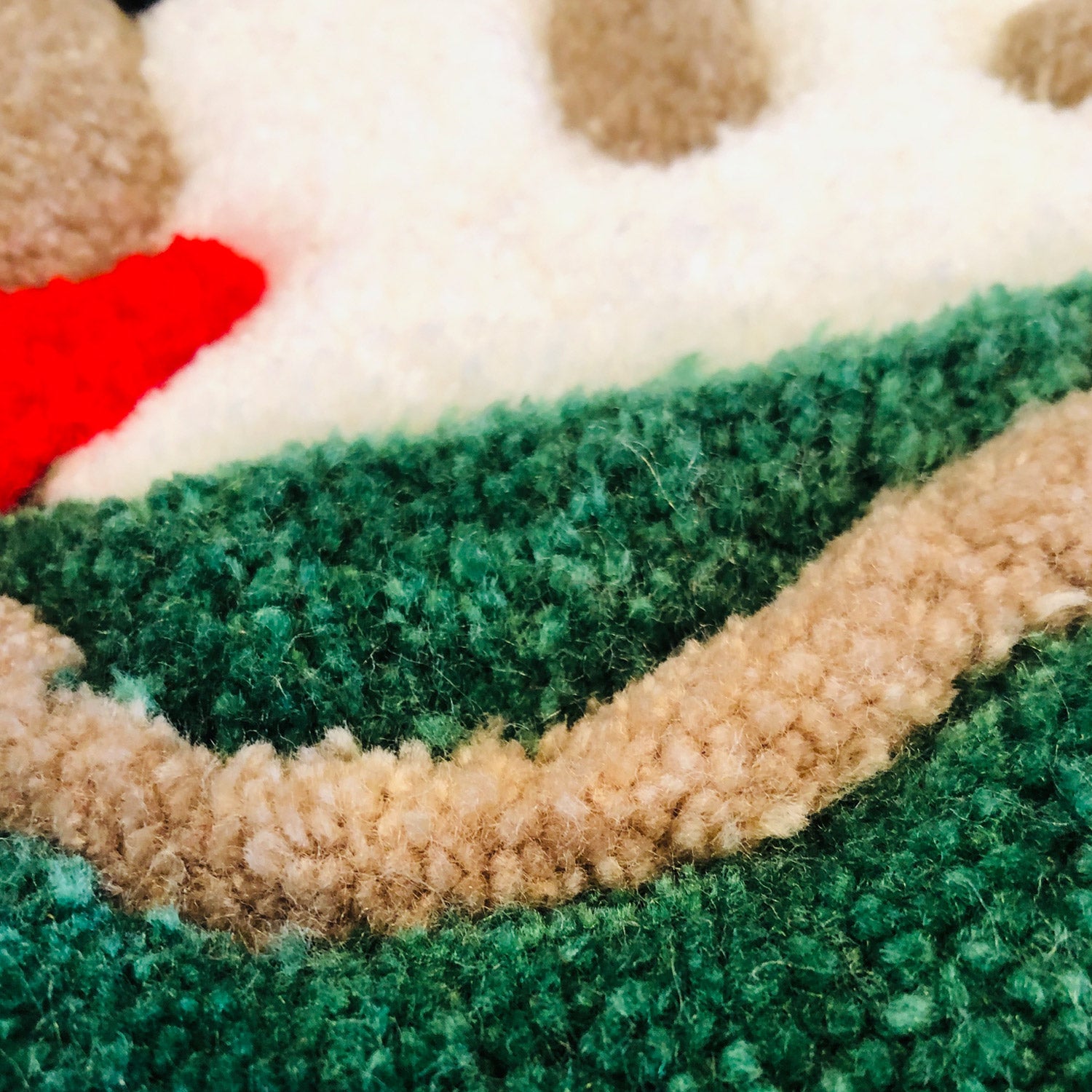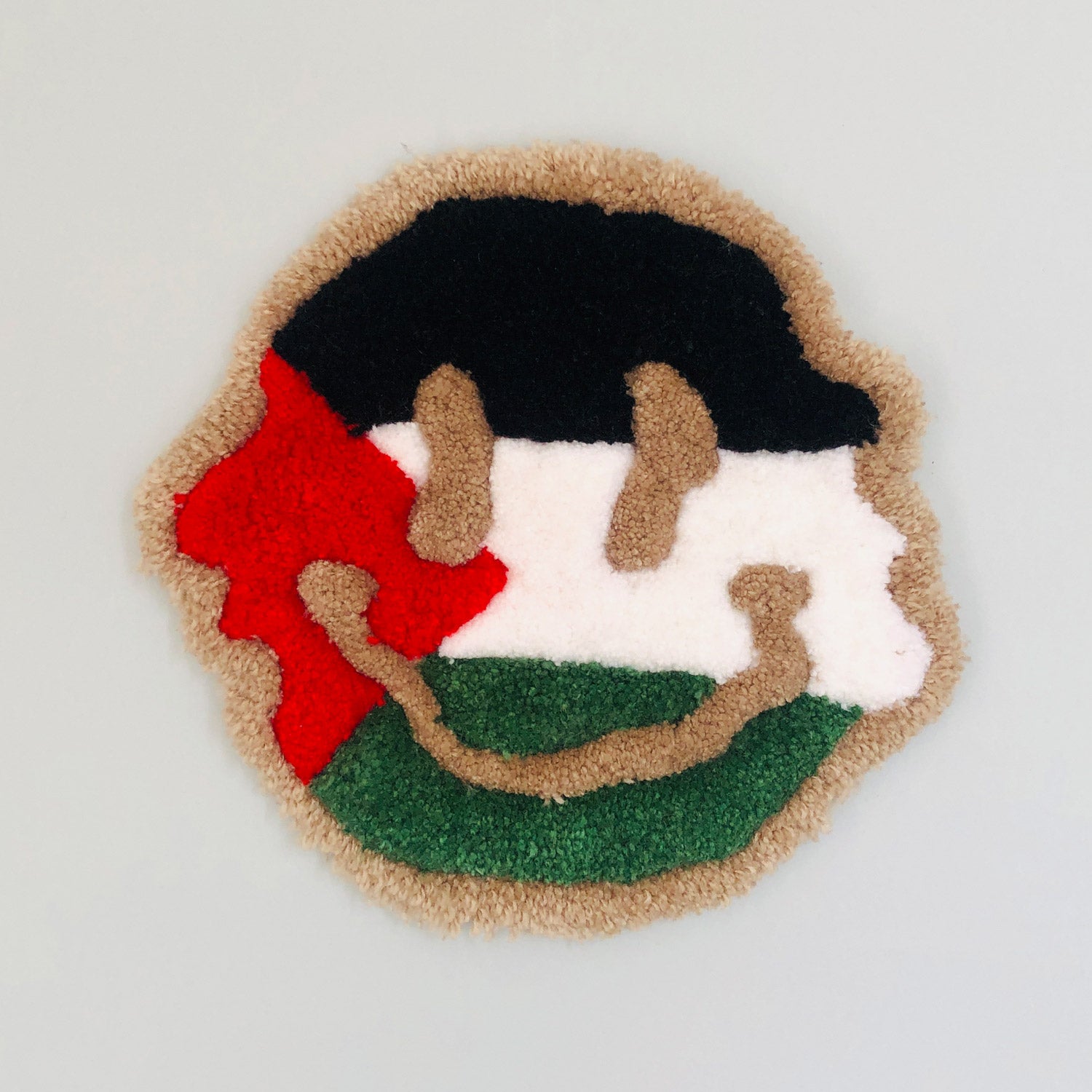Handmade rug. Shaped like a smiley face and filled with the colors of the Palestinian flag.
