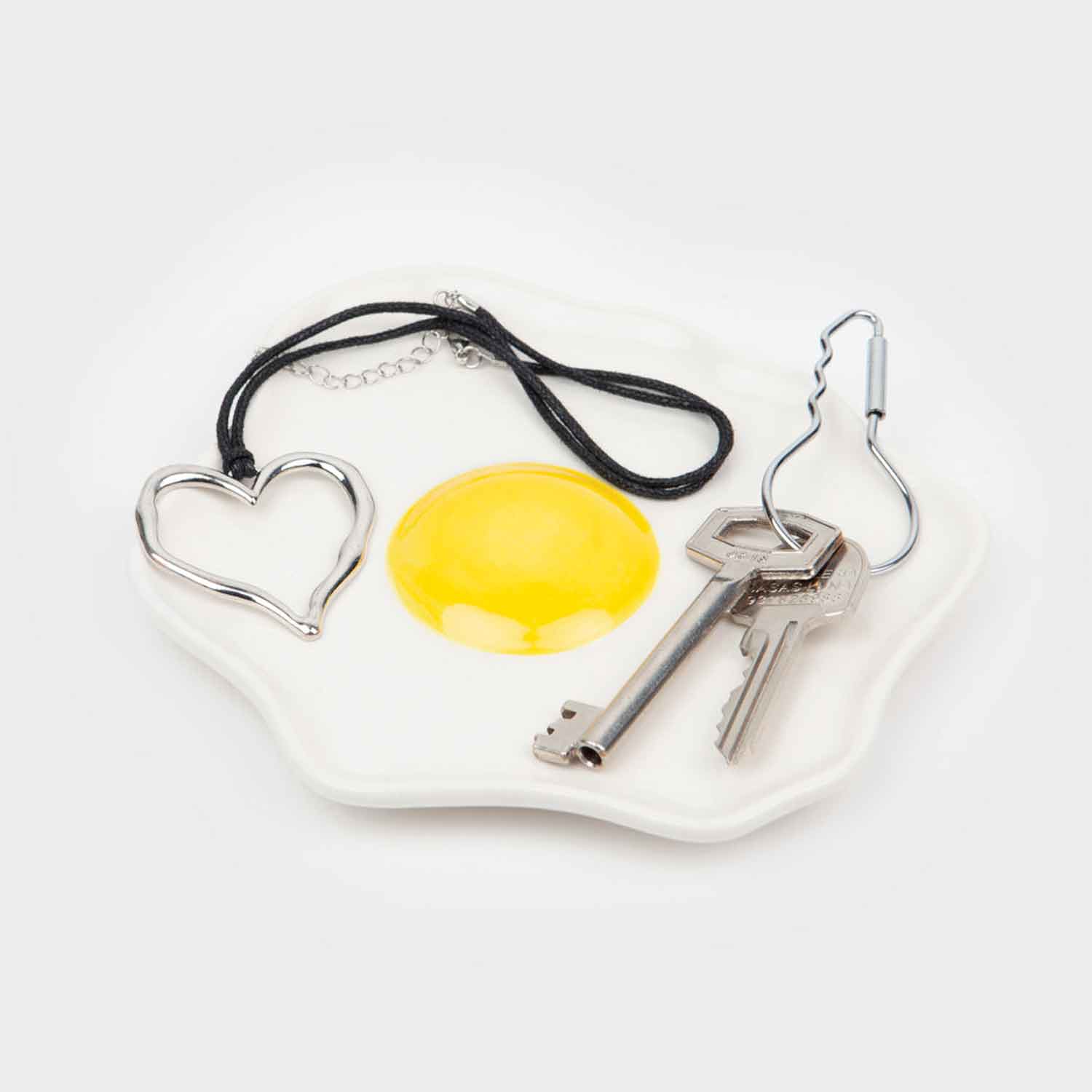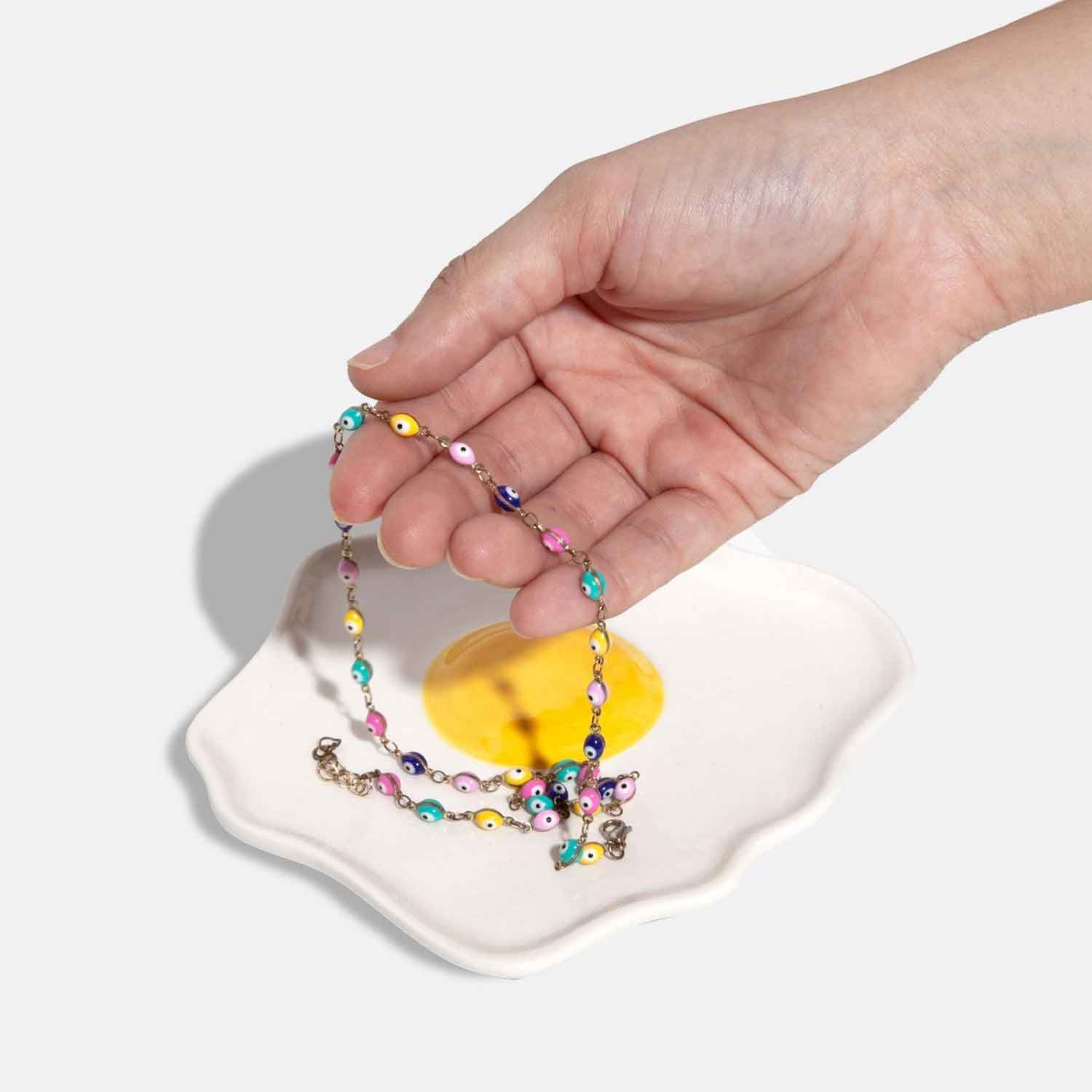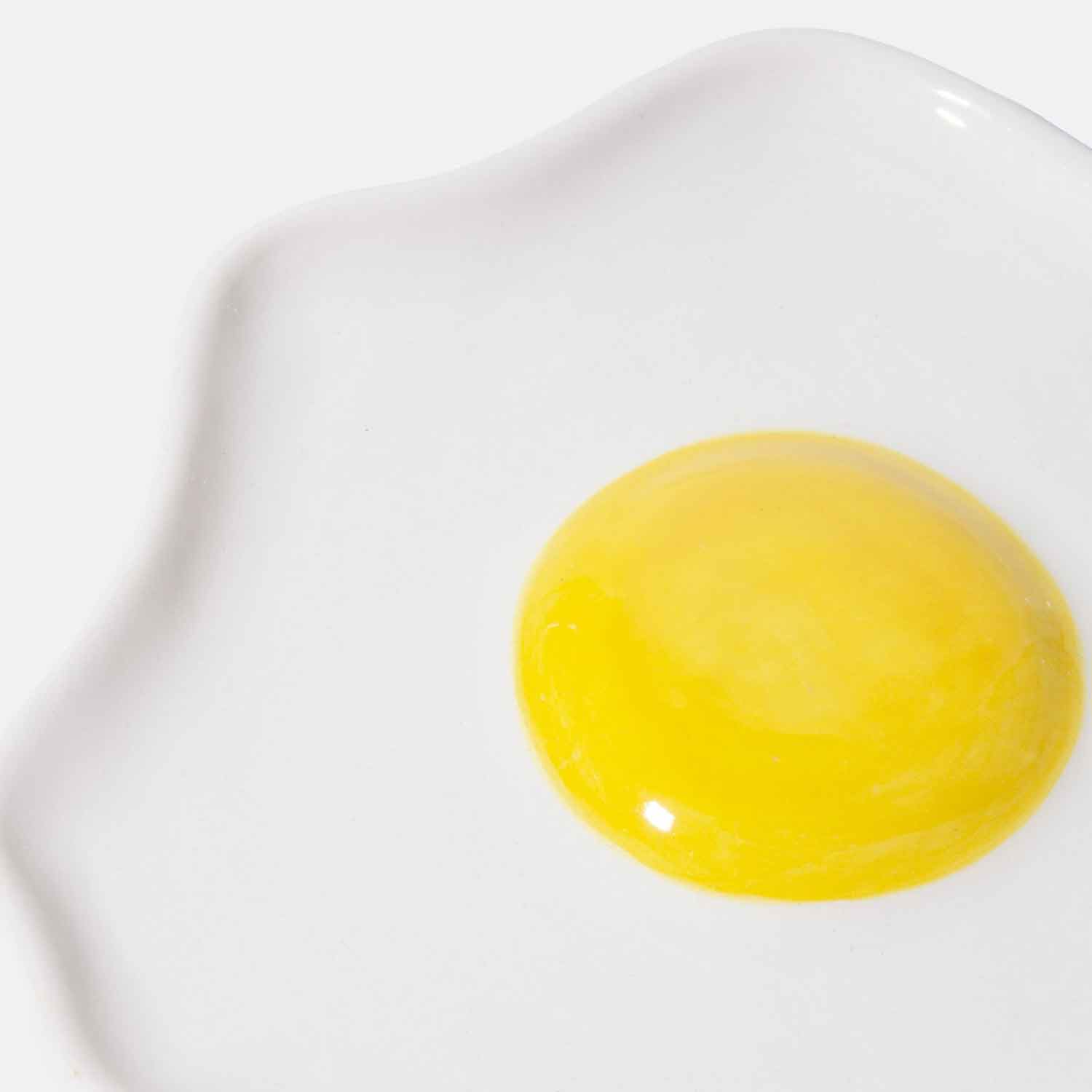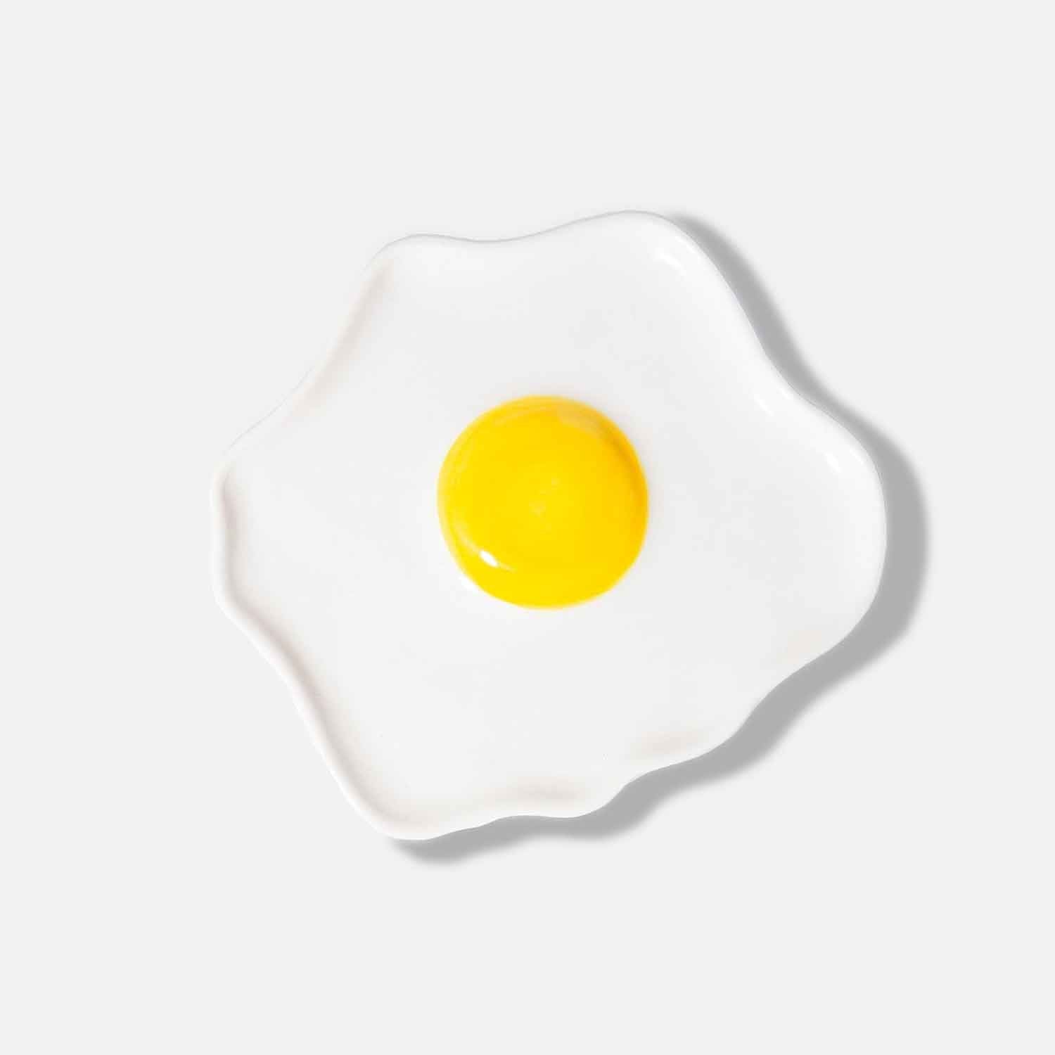 Ceramic trinket tray shaped as a fried egg, designed to take on the iconic imagery reminiscent of 1950s diner and fast-food icons, infusing your space with an irresistibly delicious retro treat.