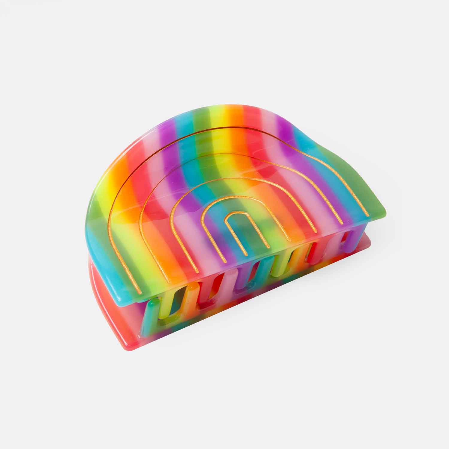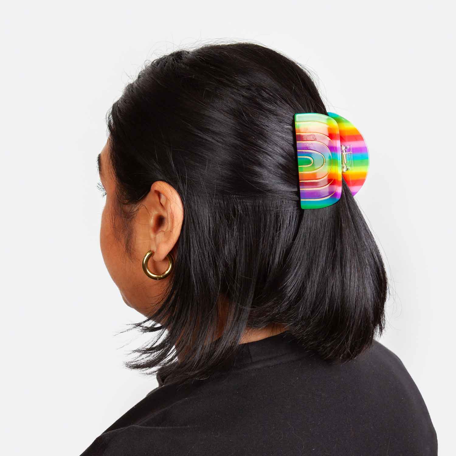 Brighten up your look with the Rainbow Hair Claw! A burst of color and joy, this accessory is the perfect way to keep your style bold and fun.