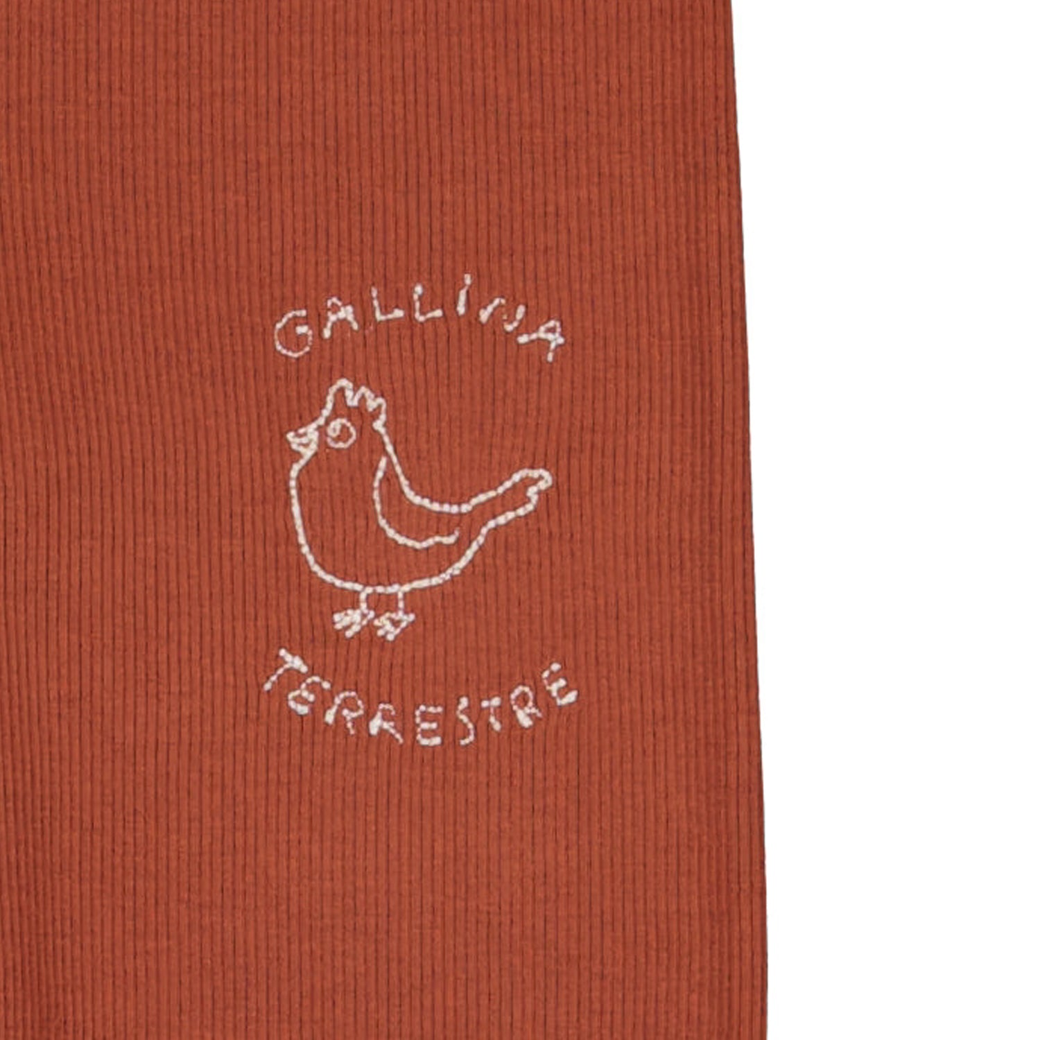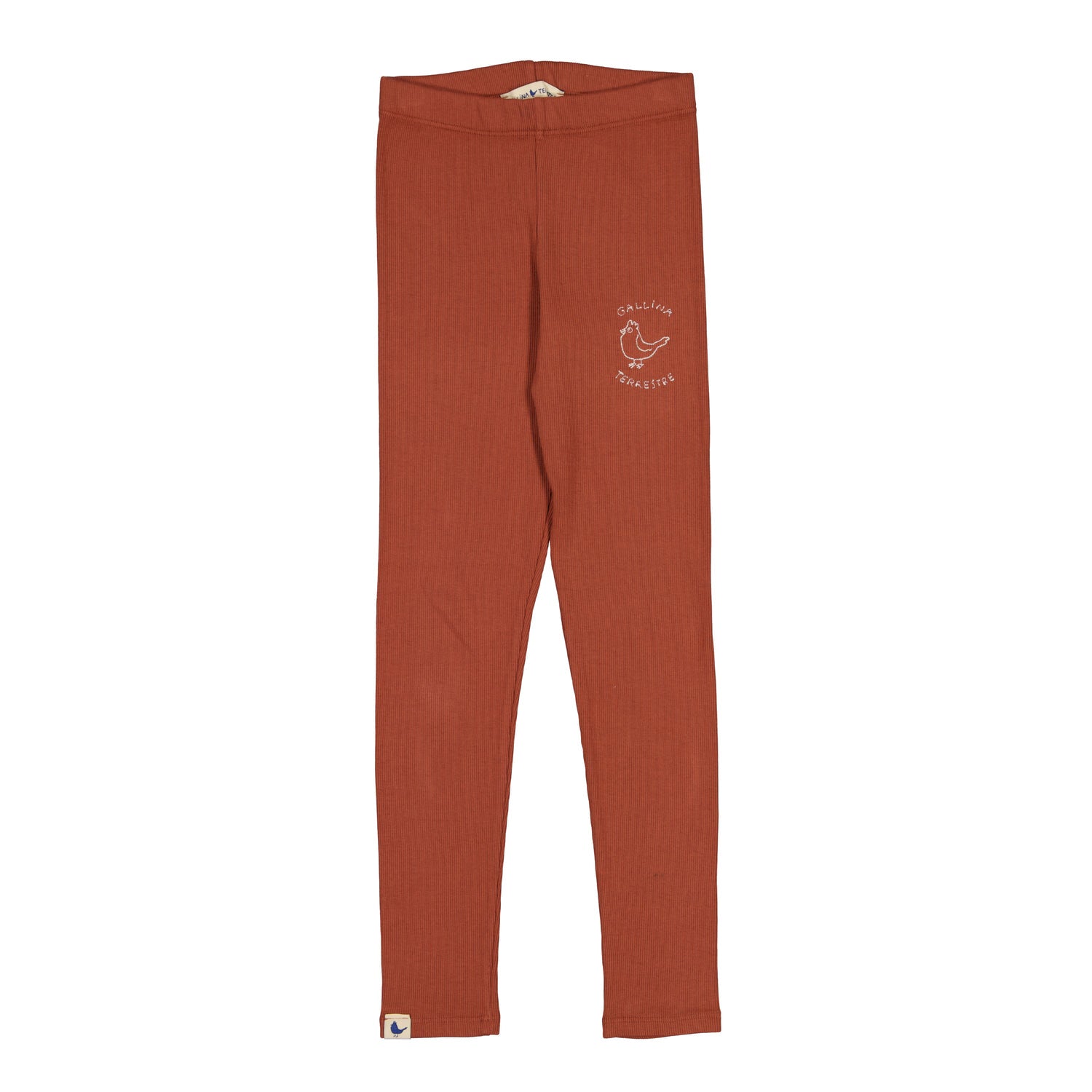 Leggings in rust colour. Logo embroidered in ecru on one side. Elasticated waistband. Made from 100% organic cotton ribbed fabric. Made in Barcelona.